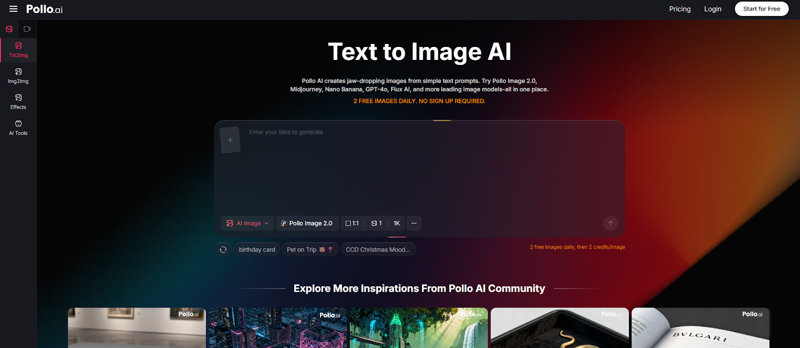 Pollo AI is a free, ultimate, all-in-one AI image and video generator designed to bring your creative vision to life. Create stunning images and generate videos from simple text prompts, existing images, or videos.