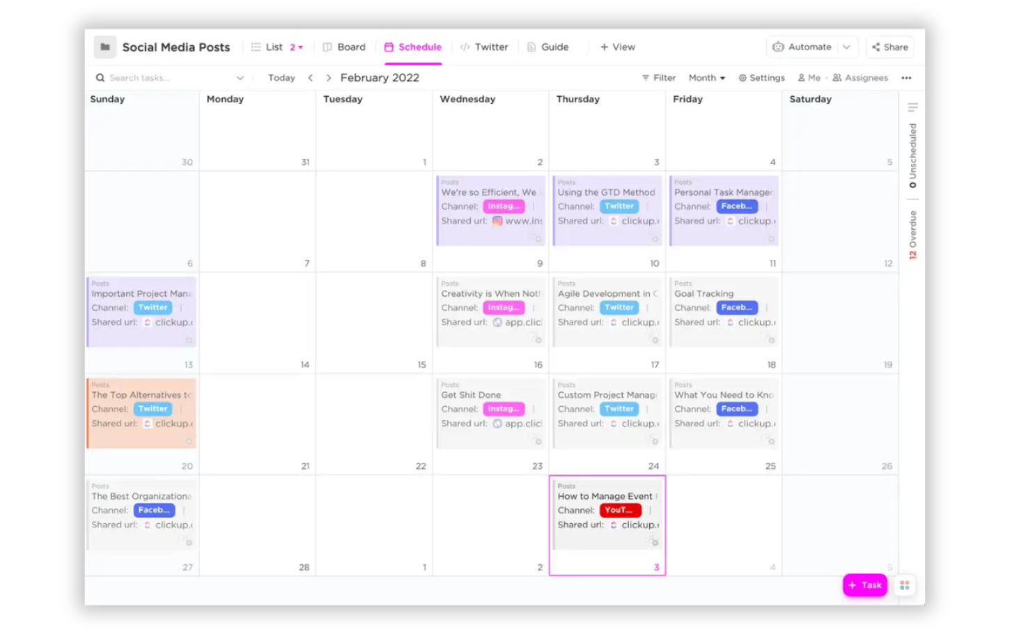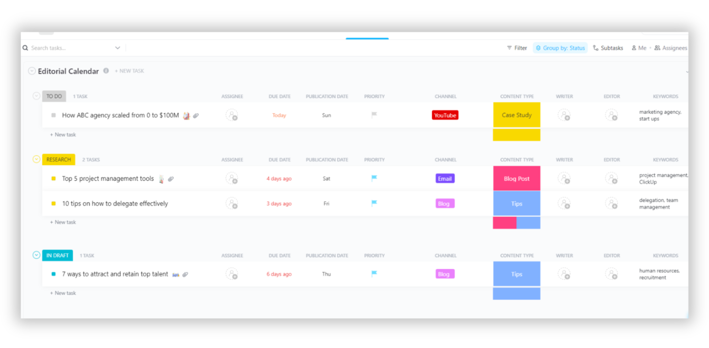 ClickUp provides a customizable workspace that can be used to plan, track, and review any content.