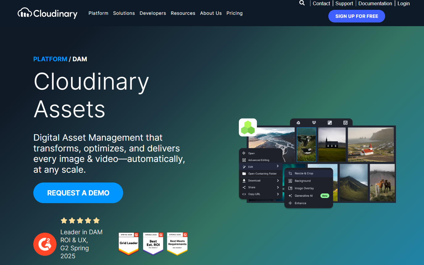 Pros: Rich media uploading, auto tagging, real-time transformation, video management, and CDN integration.