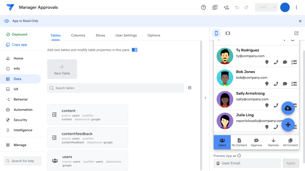 AppSheet, owned by Google, is another strong contender among the best low-code platforms. AppSheet works best when your entire workflow already lives inside the Google Sheets, Excel, or other common formats. It allows you to convert spreadsheets into functional apps without rebuilding your data structure. For teams already using Google Sheets or Excel extensively, this reduces the setup time significantly.