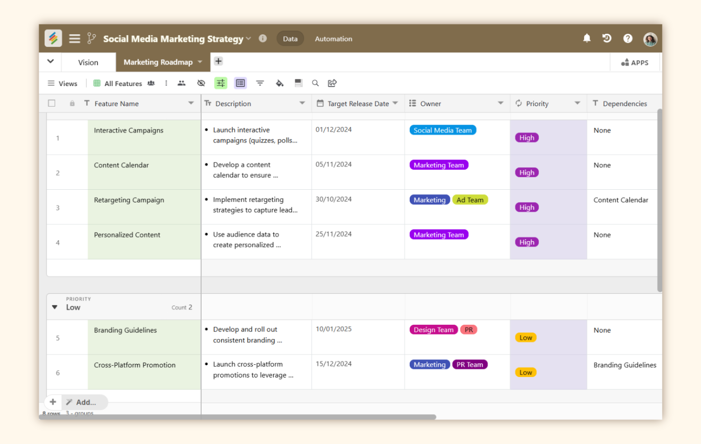 This template helps plan content schedules, publishing timelines and cross-platform rollouts. You can connect influencer deliverables to your broader calendar, so that campaign content doesn’t operate in isolation.