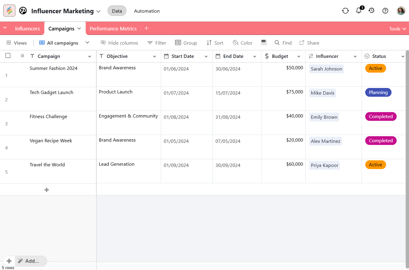 With Stackby, these workflows come together through databases. Its AI fields, automation features, forms, and dashboards, have all been designed to work in perfect harmony with how teams work. This way, teams can scale with confidence, consistency and clarity in all of their influencer campaigns. Get the most out of your influencer marketing campaigns by signing up with Stackby today.