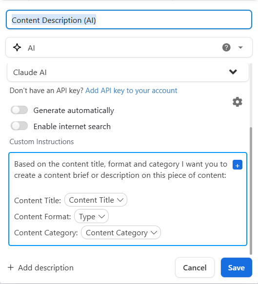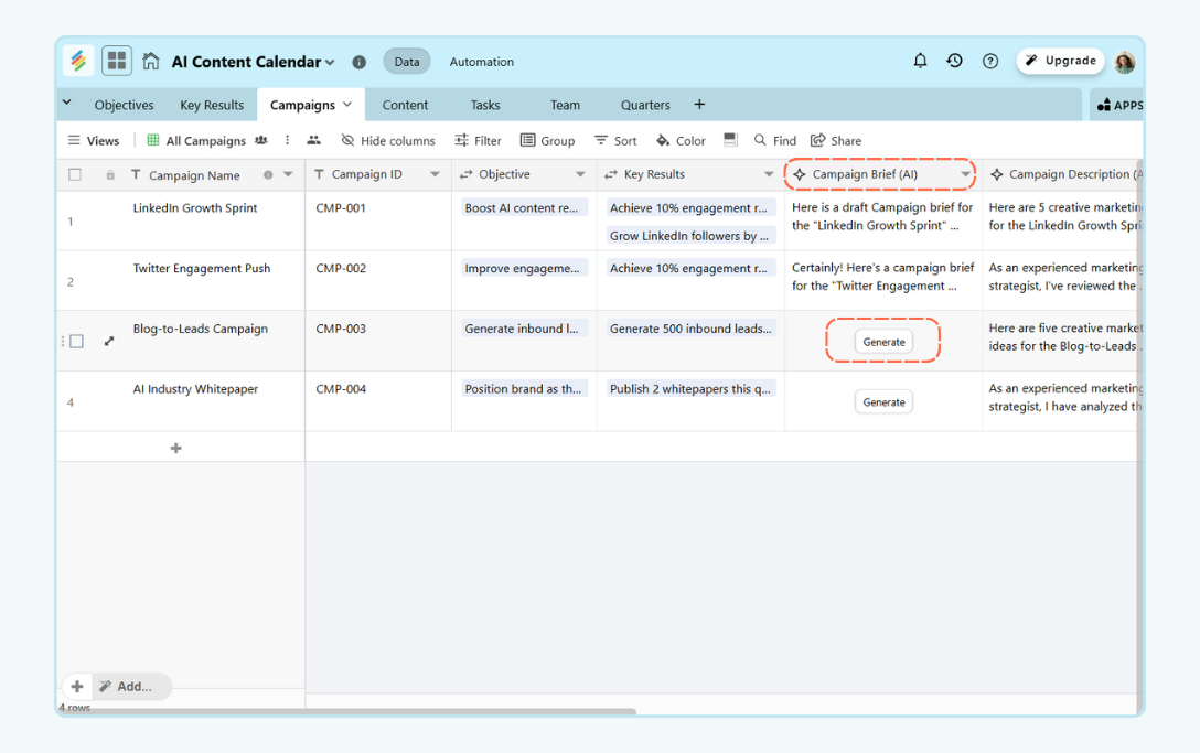 By using AI column fields, you can generate caption drafts, creative variations, copy alternatives and captions for different platforms and around influencer assets. This helps content teams scale distribution faster.