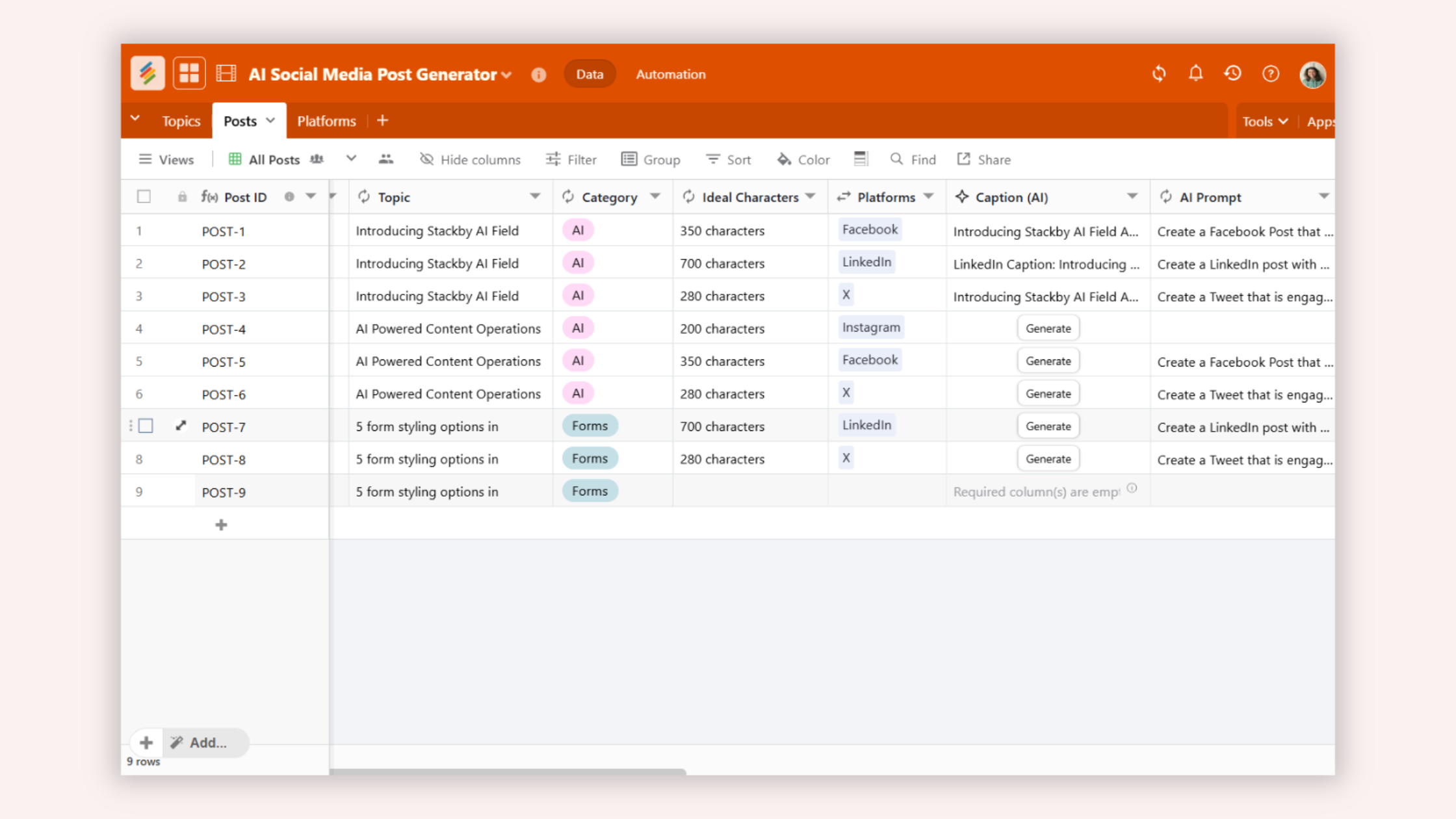 2. AI Social Media Post Generator TemplateStackby'