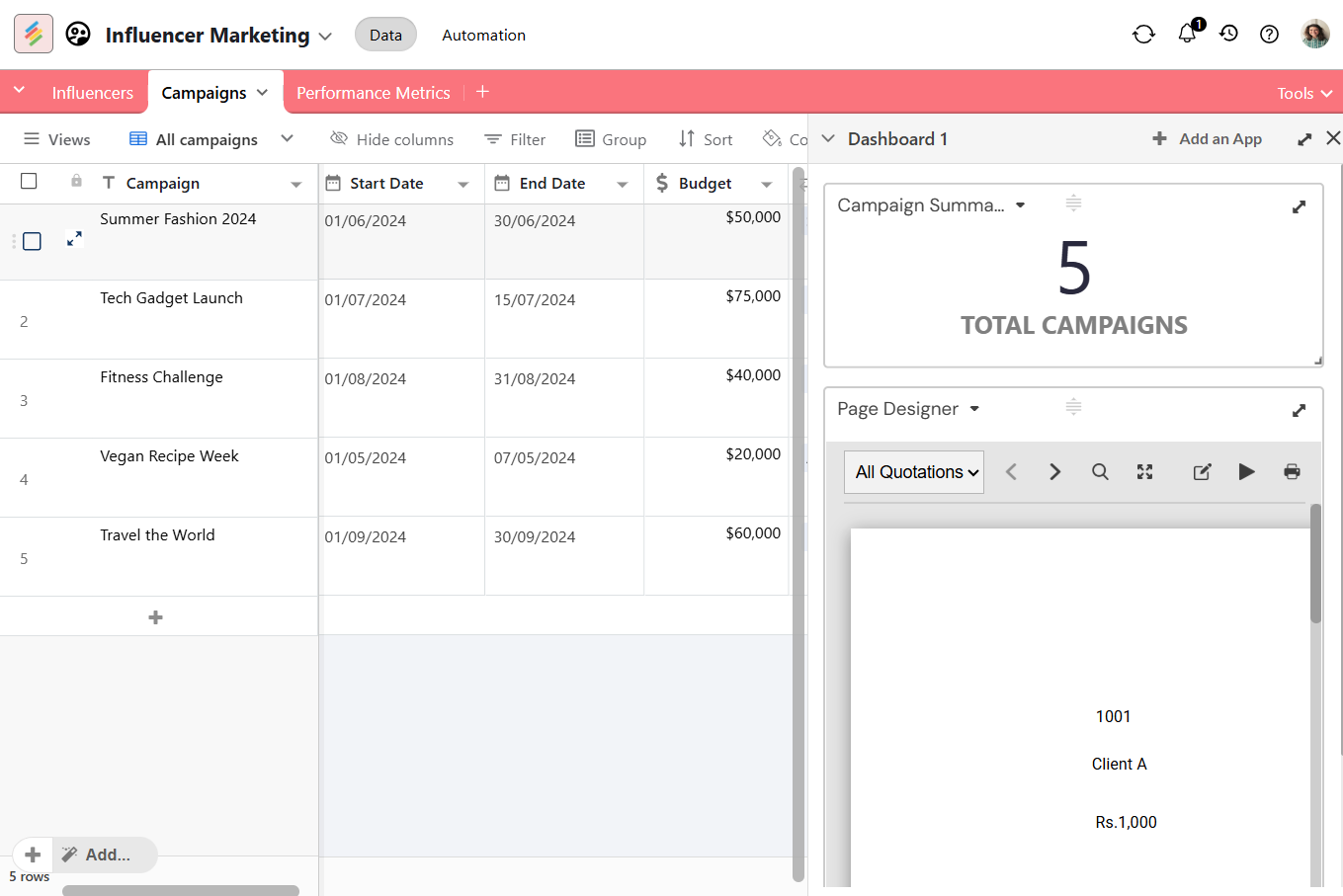 Visual dashboards add another layer. Charts, pivot summaries, goal trackers, and performance views make it easier to compare creators, formats, or campaigns at a glance.