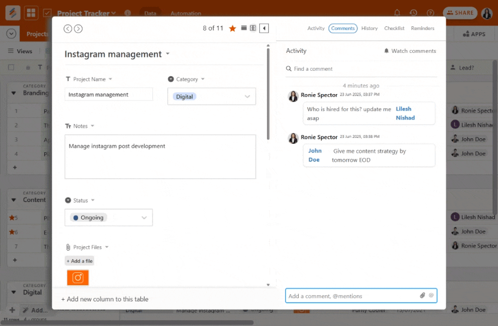 Step 3: With real-time collaboration, team members can update tasks, comment within rows, and add reminders or checklists , keeping everyone on track with each other.