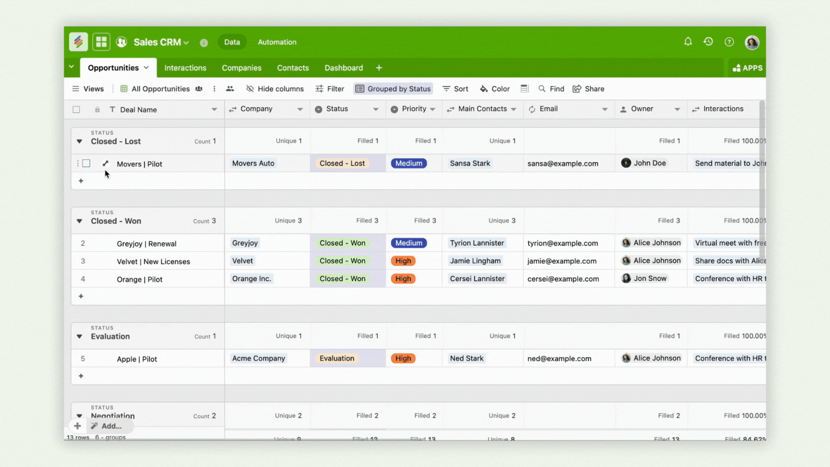 Absolutely. With 30+ unique field types, 8 visualization options, advanced form builder, reporting dashboards, internal automations, and custom activities on records, Stackby gives you everything you need to run a complete Sales CRM. You also get two-way email sync with Gmail and Outlook, so all conversations stay linked to your records.